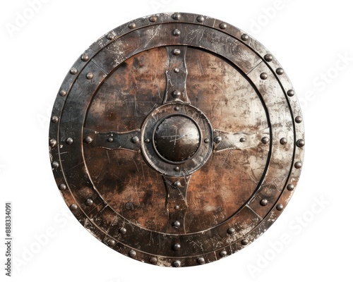© Popelniushka, Fototapeta premium Gladiator Shield. Mediaeval Viking Warrior Round Metal Shield Isolated on White Background