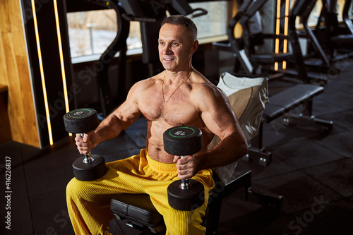Naklejka premium Gladsome gentleman with bare torso exercising at the gym