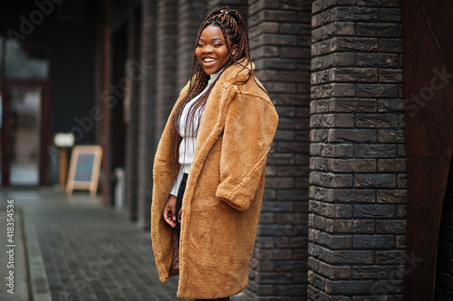 Naklejka premium Glamorous african american woman in warm fur coat pose at street.
