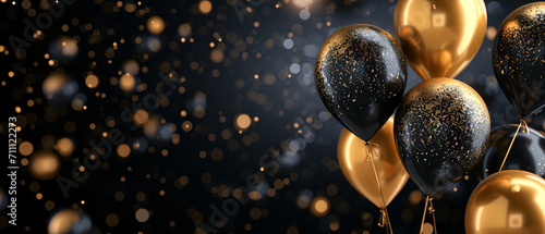 Naklejka premium Glamorous Black Party Decor Confetti and Gold Balloons.