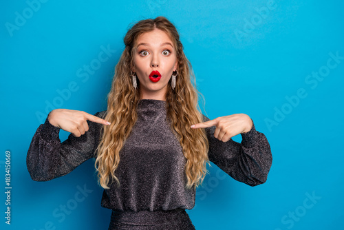 © deagreez, Fototapeta premium Glamorous girl points at herself with surprised expression wearing shiny dress against blue background for holiday fashion stock photo