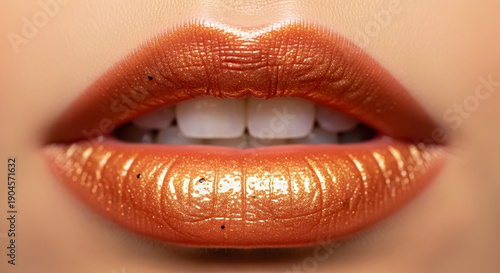 Fototapeta premium Glamorous Shimmering Orange Lips with Metallic Lipstick Close-up