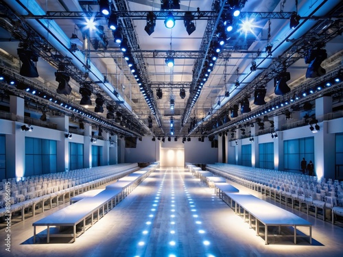 Naklejka premium Glamorous vacant runway illuminated by modern lights awaits models, surrounded by tiered seating and stylish decor, perfect for high-end fashion event photography.
