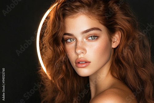 © Leo Rohmann, Fototapeta premium Glamorous young woman with soft curls and glowing complexion posing under a halo light in a dark studio setting radiating elegance and modern sophistication