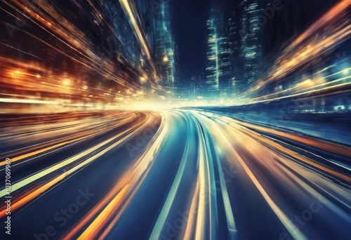 © Mariia, Obraz premium Glare on an empty night road. Speed, view from the car, bright lights, night city