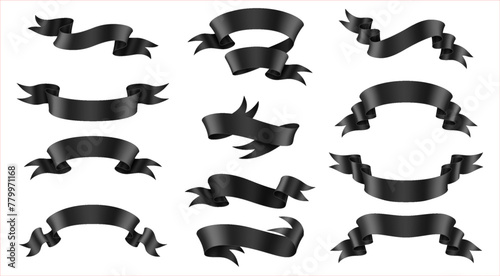 © ApoevArt, Naklejka premium Glaring black silk ribbons realistic vector illustration set. Luxury decorative design elements 3d models on white background. Holiday art