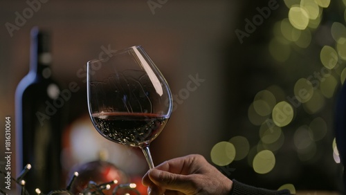 Fototapeta premium Glass and bottle of red wine on table in Christmas decorated home. Man swirling tasting buying wine. Photo for web shop ads and vinery holiday offer.