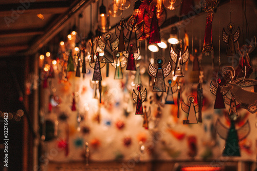 Fototapeta premium Glass angel ornaments in front of a stall on the Christmas Market in Bruges,...