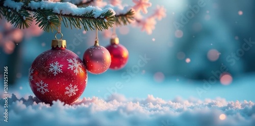 © Manae, Obraz premium Glass balls with glittering snowflakes on the branch, glass, ornaments, winter
