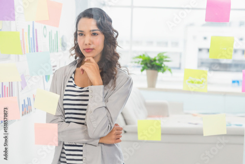 Naklejka premium Glass board displaying pastel sticky notes and printed charts in modern...