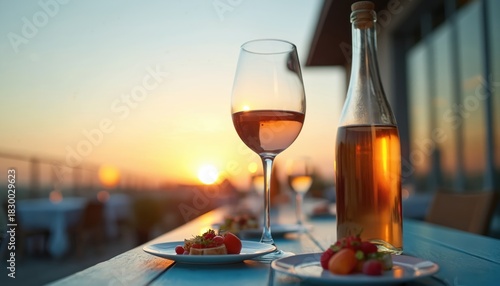 © Viktor, Obraz premium Glass, bottle of rose wine on table at rooftop restaurant. Appetizers served for romantic dinner during golden sunset. Outdoor terrace cafe with scenic city view at summer evening. Nobody present at