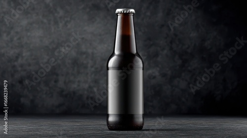 © Mykola, Fototapeta premium Glass Bottle Soda Mockup. Blank Black Beer Bottle with Label on Dark Background