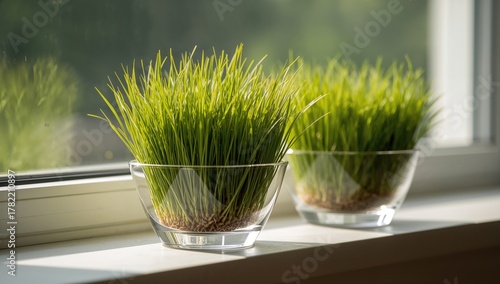 Fototapeta premium Glass bowls filled with wheat grass on a windowsill, highlighting a...