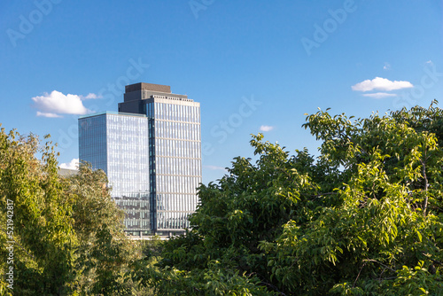 © gicku91, Fototapeta premium Glass building facade behind growing trees under blue bright sky