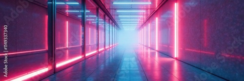 Fototapeta premium Glass corridor with metallic floor and soft glow, minimalist, futuristic