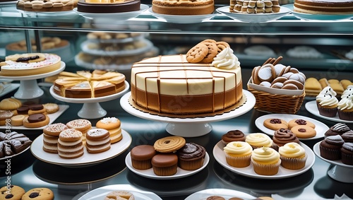 © Samad, Naklejka premium Glass display case filled with an enticing variety of pastries, featuring colorful cakes, tarts, and sweet treats