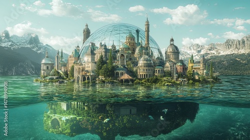 Fototapeta premium Glass dome city on ocean floor.