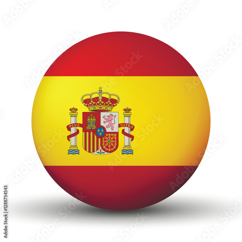 © Alla, Obraz premium Glass light ball with flag of Spain. Round sphere, template icon. Spanish national symbol. Glossy realistic ball, 3D abstract vector illustration highlighted on a white background. Big bubble.
