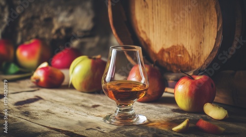 Naklejka premium Glass of Apple Brandy with Fresh Apples and Wooden Barrel. Generative AI