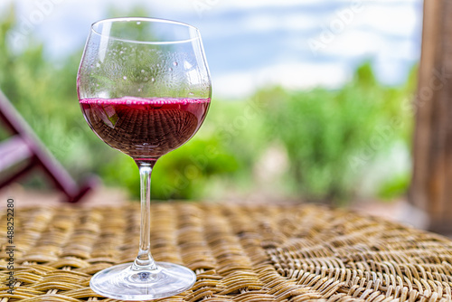 Obraz premium Glass of dark red purple wine or cranberry juice on wicker table in Santa Fe desert garden backyard with closeup of one drink and bokeh background of scenery