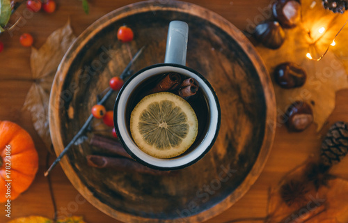 Fototapeta premium Glass of hot steaming tea and autumn plants on wooden table .