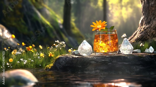 Fototapeta premium Glass of Orange Juice with Flower Garnish in Forest Setting