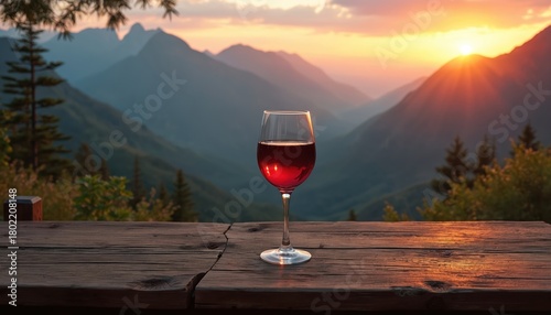 © miss irine, Naklejka premium Glass of red wine on wooden table. Mountain range in background at sunset. Glass on rustic wood with trees, hills. Red wine glass on table with natural scenery. Mountain view with glass of wine on