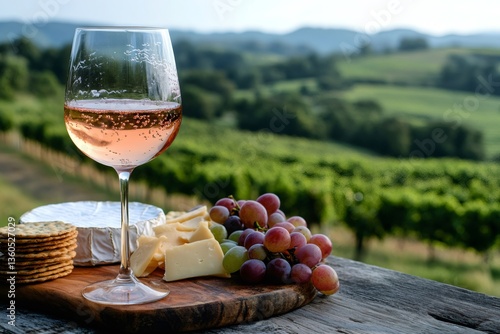 Fototapeta premium Glass of rose wine with cheese and grapes overlooking vineyard at sunset