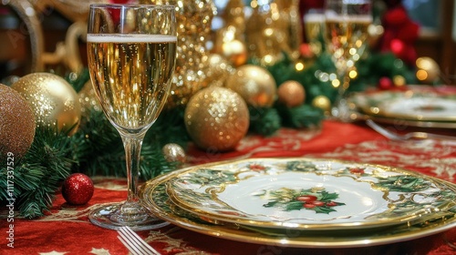 © Srisa, Naklejka premium Glass of sparkling champagne on a festive table with golden decorations