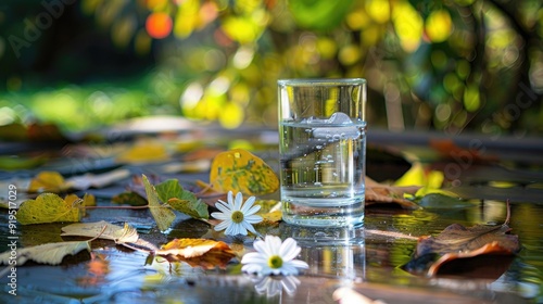 © Inkreatif, Naklejka premium Glass of water on a wooden surface with fallen leaves and white flowers.