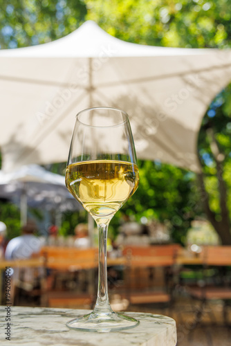 © Evgeny Karandaev, Naklejka premium Glass of white wine on sunny terrace