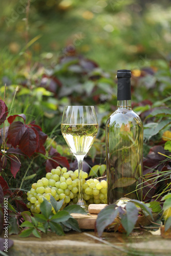 © Haletska Olha, Fototapeta premium glass of white wine on wooden background with grape