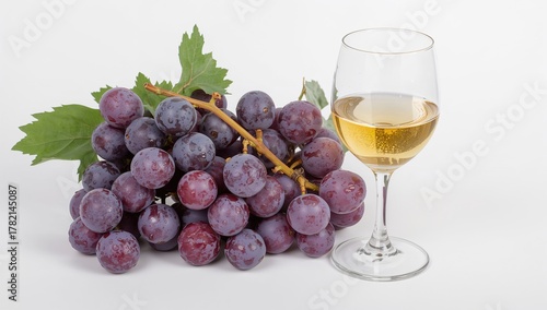 © The 2R Artificiality, Naklejka premium Glass of wine and bunch of ripe grapes on a white background