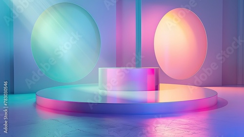 Obraz premium Glass round discs, transparent disc, round flat panels with refraction , highlights, sun rays, sunlight, geometric , 3D, illustration, horizontal wallpaper