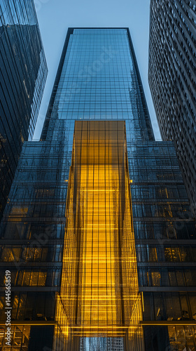 © PhotoArtHub, Naklejka premium Glass skyscraper at dusk, reflecting city lights, showcasing a striking contrast between blue and gold hues, symbolizing modern architecture and urban dynamism