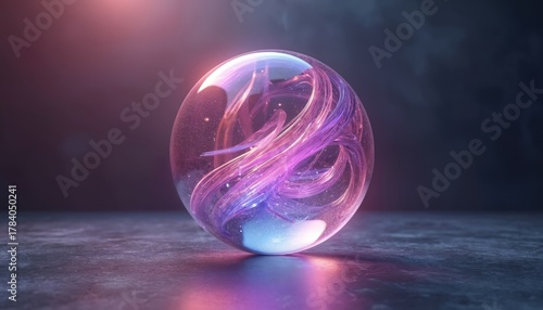 © miss irine, Fototapeta premium Glass sphere with purple luminous energy inside. Abstract futuristic orb rotates on dark reflective surface. Cosmic glowing substance, digital art.