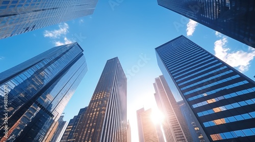 © Gen99, Fototapeta premium Glass tower with reflections in a bustling city skyline.