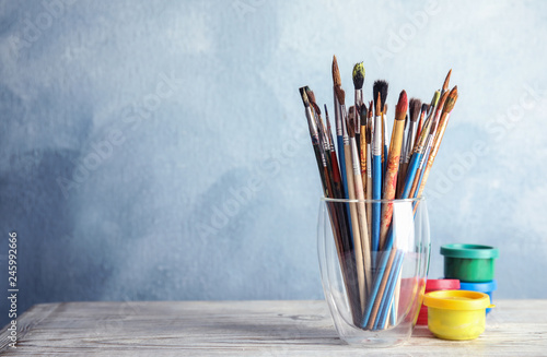 Fototapeta premium Glass with brushes and paint jars on table against color background. Space for text