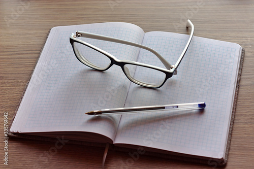 © EvgenyBelenkov, Fototapeta premium glasses and a pen on a notebook for writing