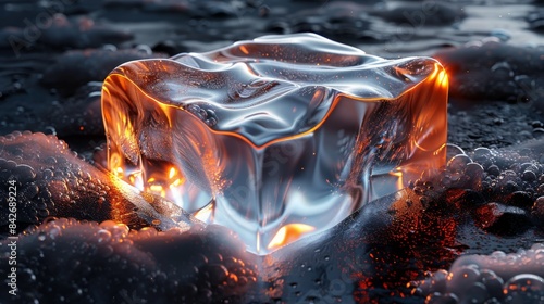 © imlane, Naklejka premium Glassy orthorhombic slice with a hollowed-out center, transparent and unadulterated glassy texture, 2 mm thick, highlights with glass reflections, black background, photorealistic style, dramatic ligh
