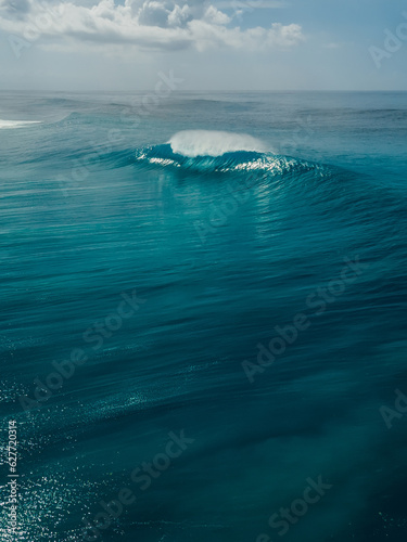 © artifirsov, Naklejka premium Glassy wave with barrel in blue ocean in Bali. Aerial view