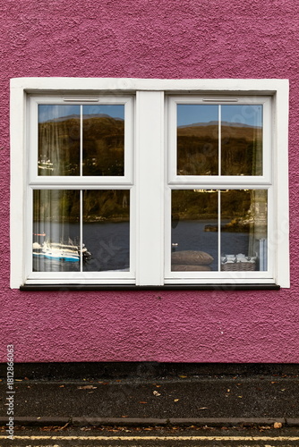 © rweisswald, Fototapeta premium Glazed, double hung window reflecting the harbor with some boats, set in a purplish-pink painted, ancient fisherman's house. Portree-Skye-Scotland-091