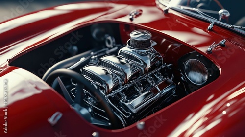 © Virsa, Obraz premium Gleaming Chrome Engine of a Classic Red Sports Car