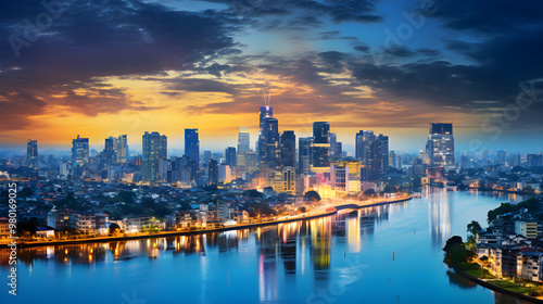 Fototapeta premium Gleaming Dusk View of Hanoi City Skyline Vibrant Architectural Marvels &...