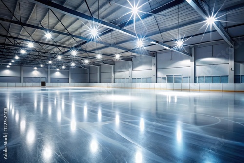 Fototapeta premium Gleaming Ice Surface in a Modern Indoor Skating Rink with Bright Overhead...