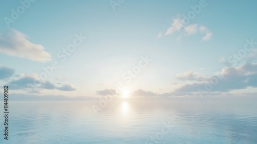 © heinng, Fototapeta premium Gleaming sun slowly sets over calm sea sky wide shot photo. AI Generated