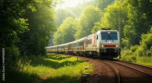 © asolaja, Naklejka premium Gleaming train winds through verdant forest