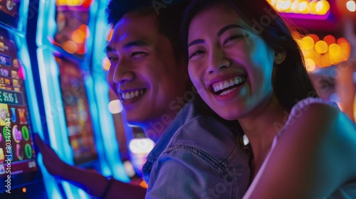 © ChaoticMind, Obraz premium Gleeful couple share a moment of pure happiness with casino games surrounding them in vibrant hues