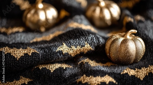 Naklejka premium Glimmering Gold Pumpkins on Black Bat Patterned Fabric for Halloween