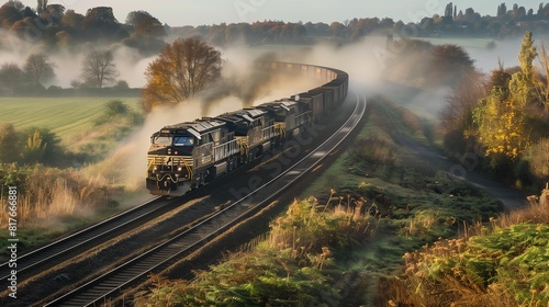 © Usman, Fototapeta premium Glistening charcoal freight train crossing a misty countryside, ample text space on left.
